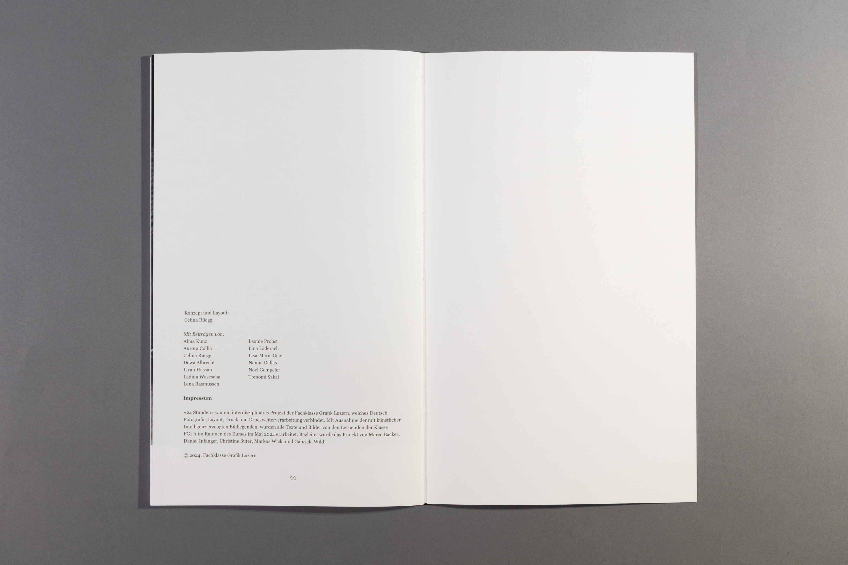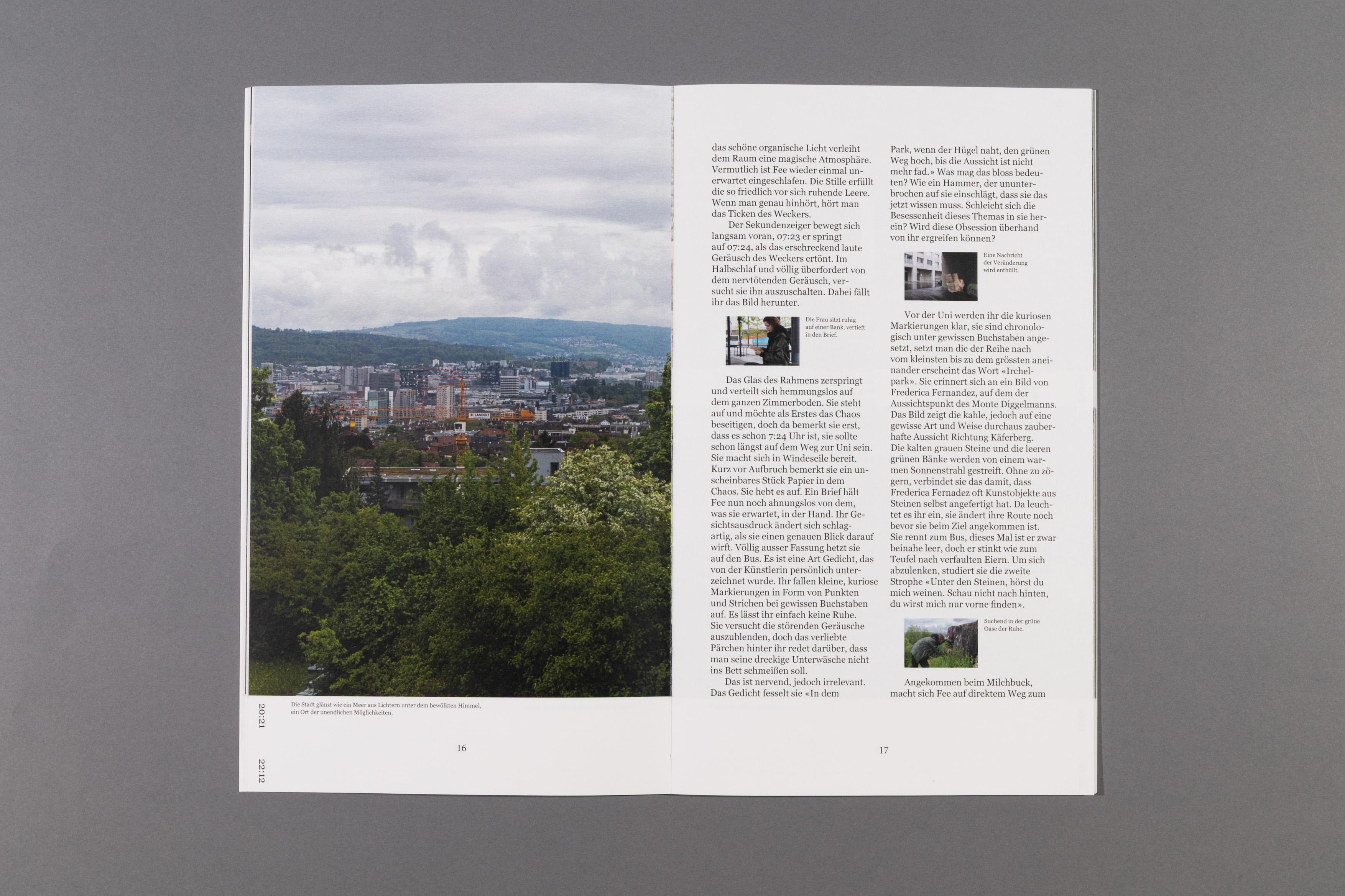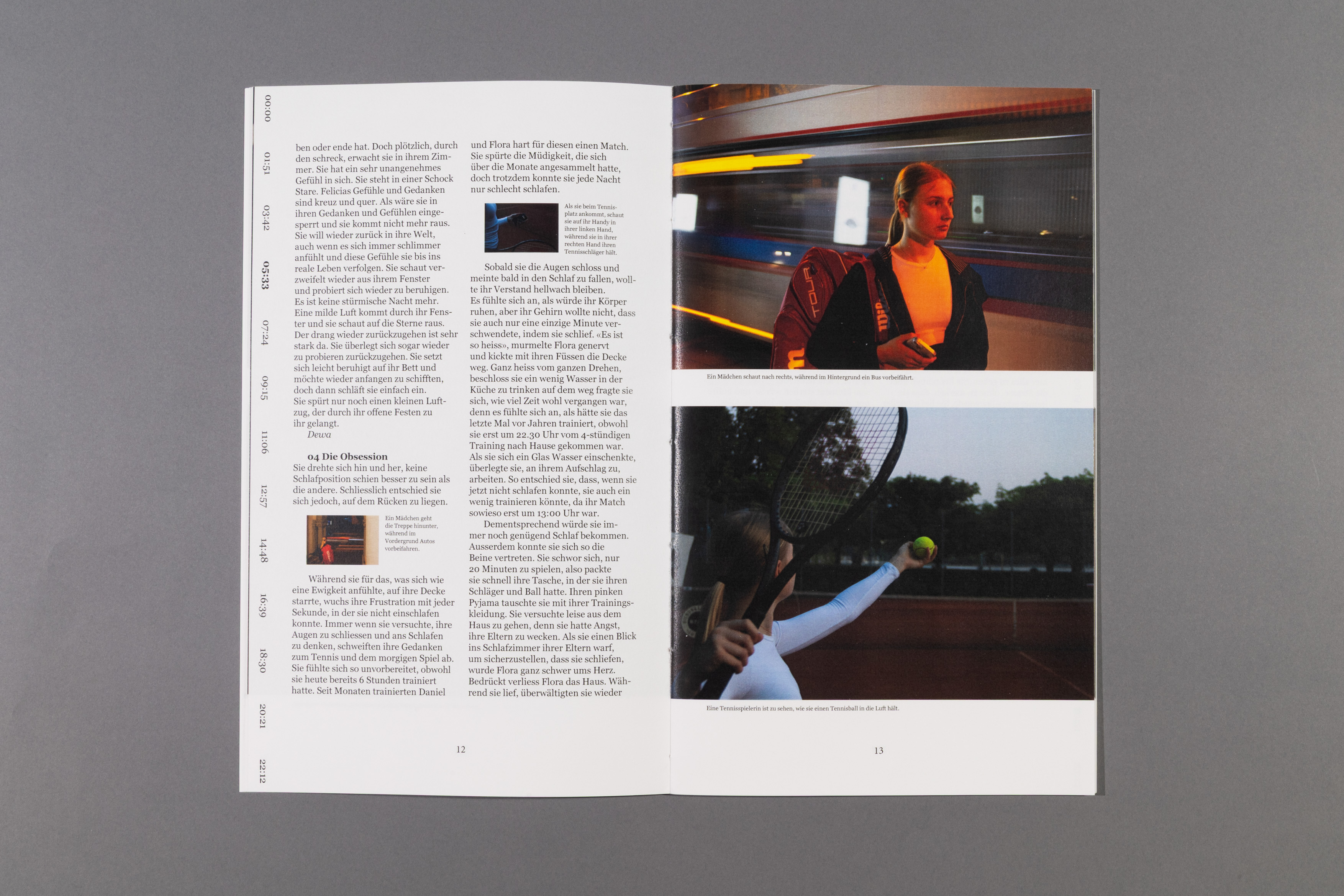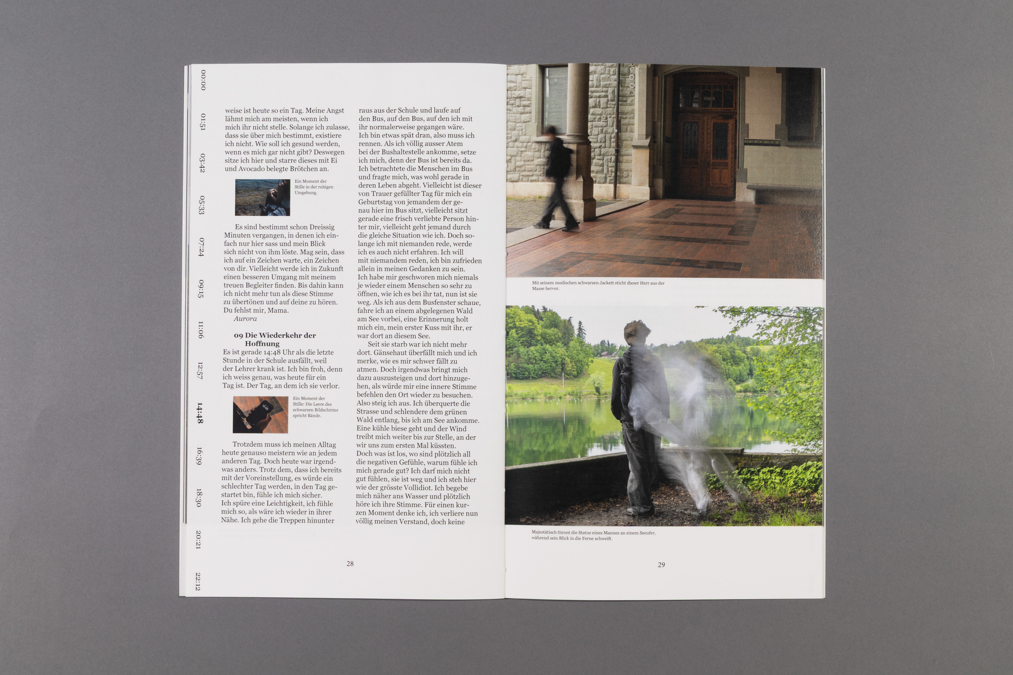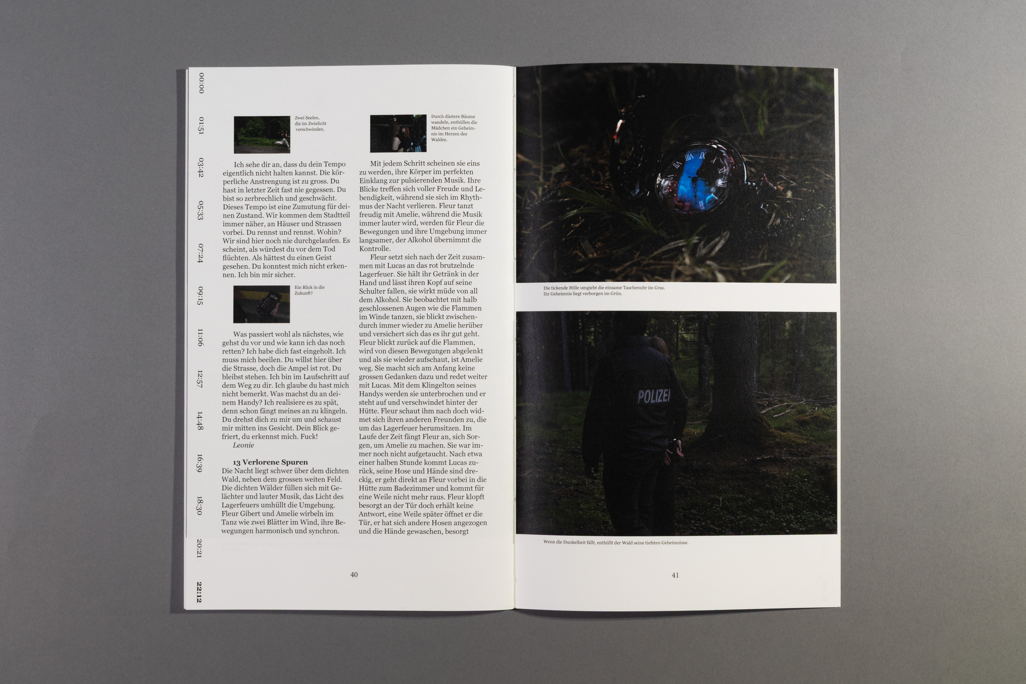 How much happens in just 24 hours? The project is based on the concept by artist Christian Marclay and his work "The Clock". Within the class, each person was assigned a specific time and developed a short story with an accompanying photo series. The resulting contributions were compiled into a book structured according to a chronological timeline. Marked times connect text and images into a coherent sequence. The result is a visual collection of parallel actions that illustrates the simultaneity of human experience.