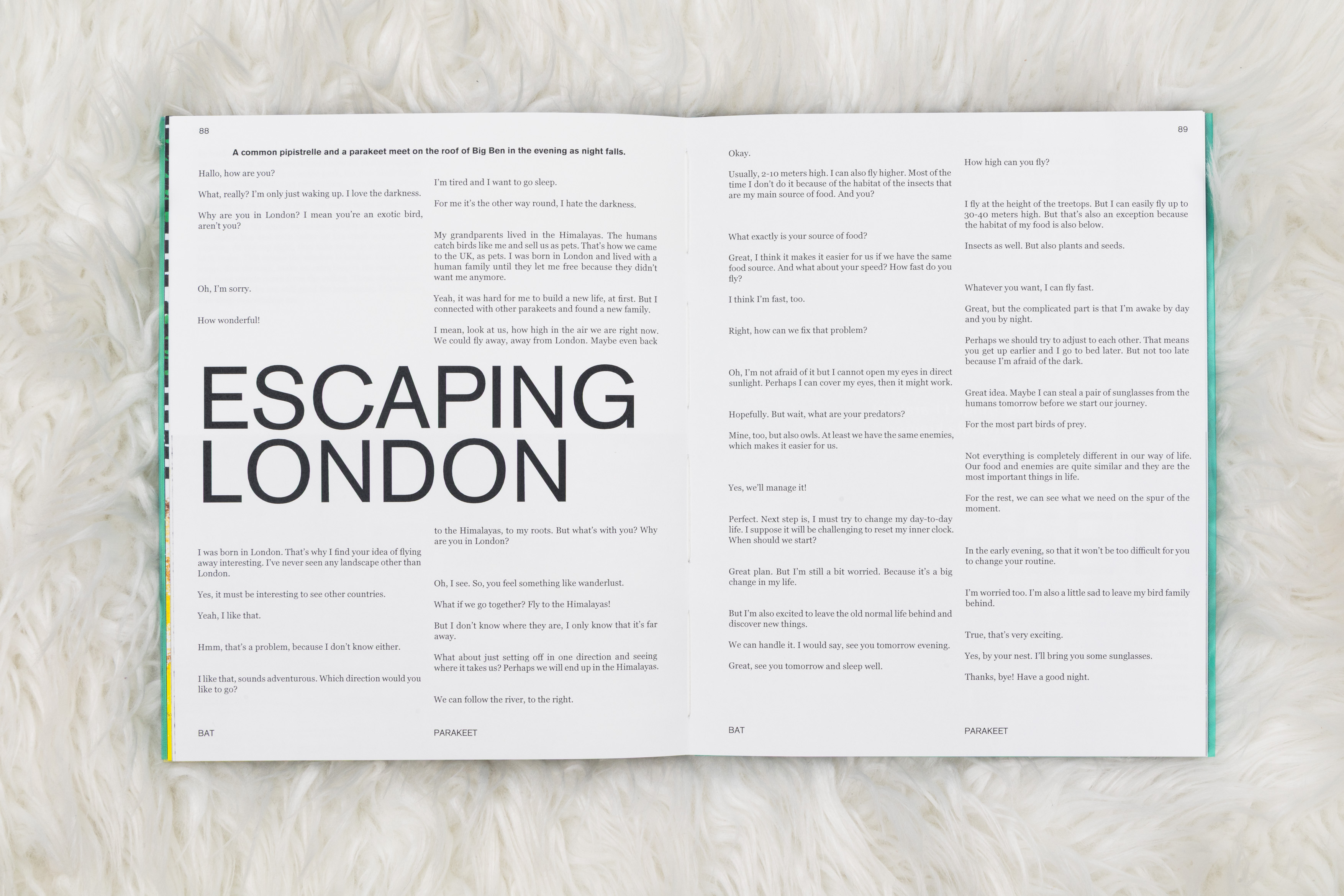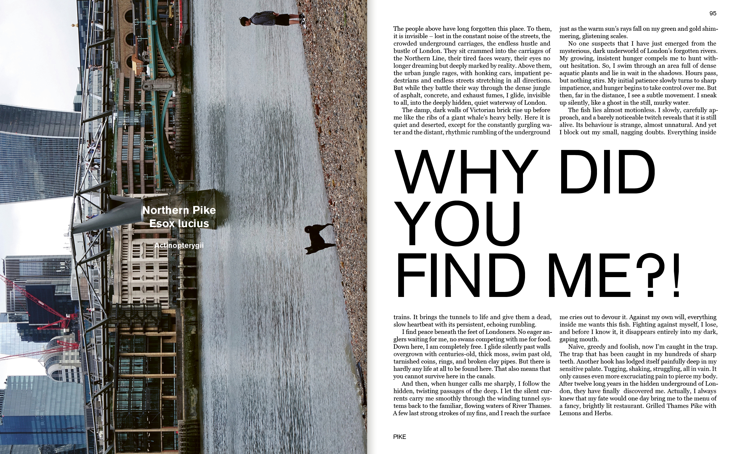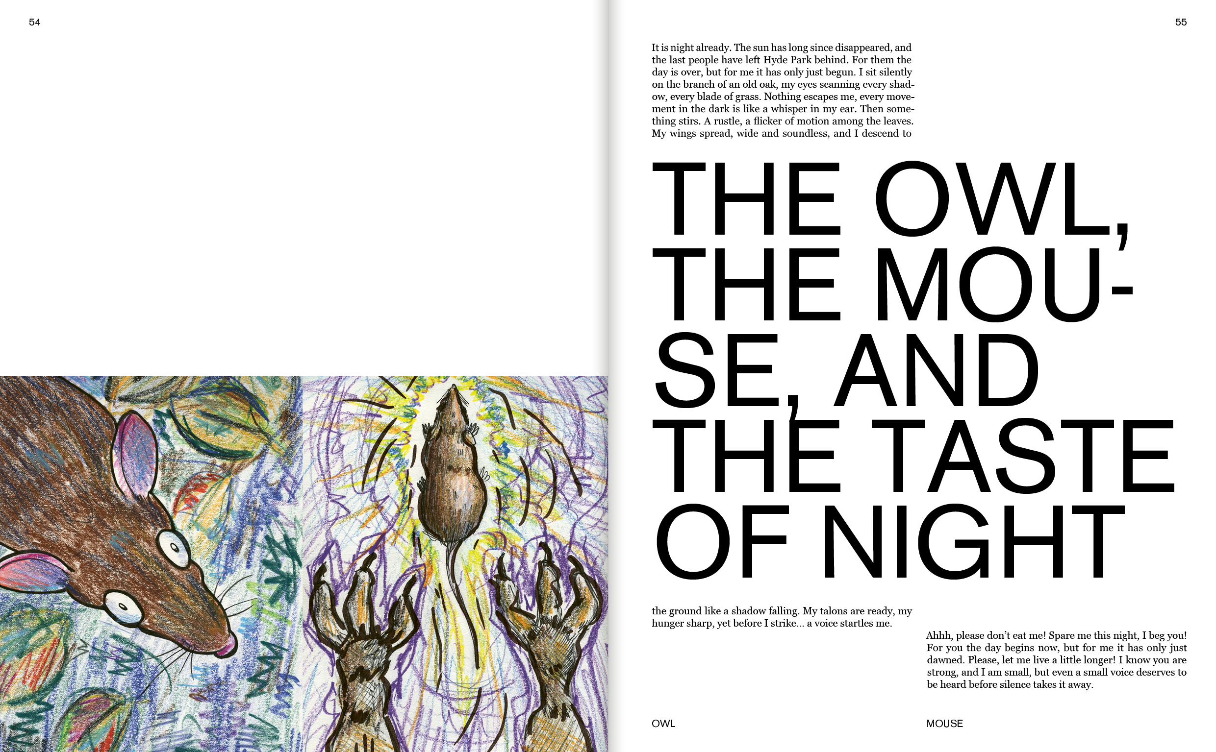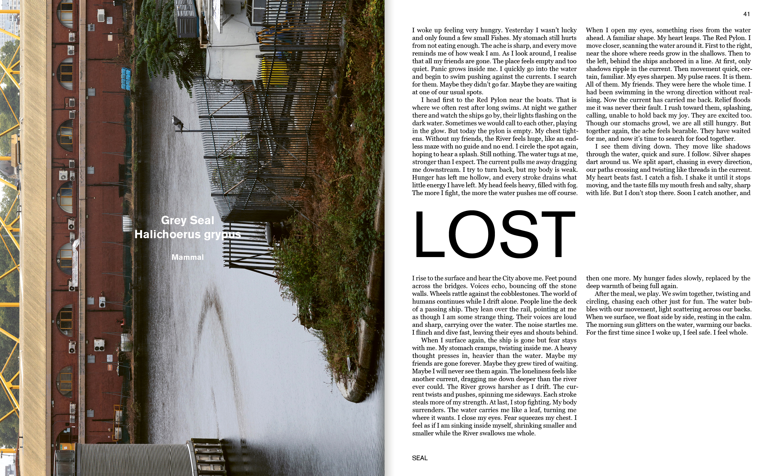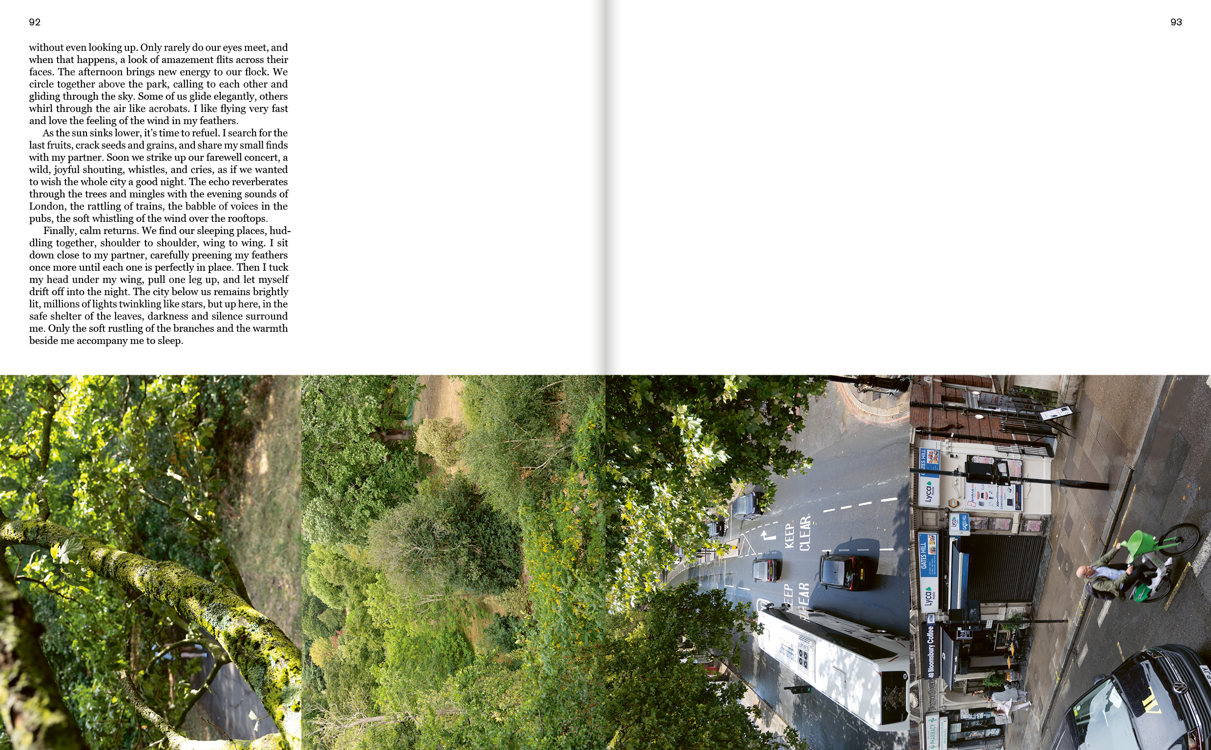 Big cities like London are full of surprises, even in places where you least expect them. This book shows that wild animals have long become part of the urban habitat. Foxes, birds, and pikes appear as silent cohabitants of the city. Short dialogues paint a picture of urban nature, while abstract image sequences create a visual pause and reveal the animals’ perspective. In this way, “When the City Roars” becomes a loud narrative about quiet life – a glimpse into the wild heart of London that continues to beat even amid the urban hustle and bustle.
