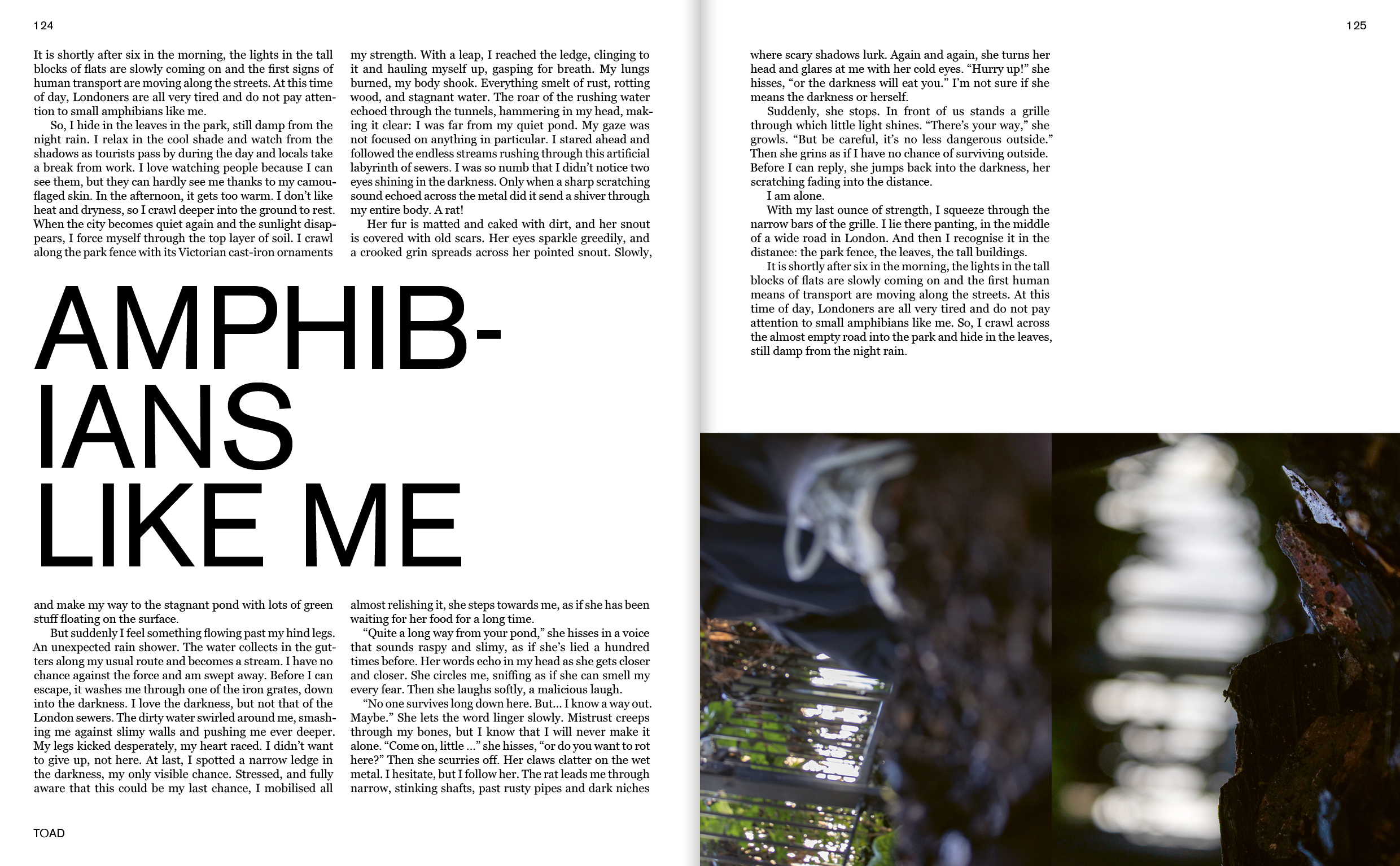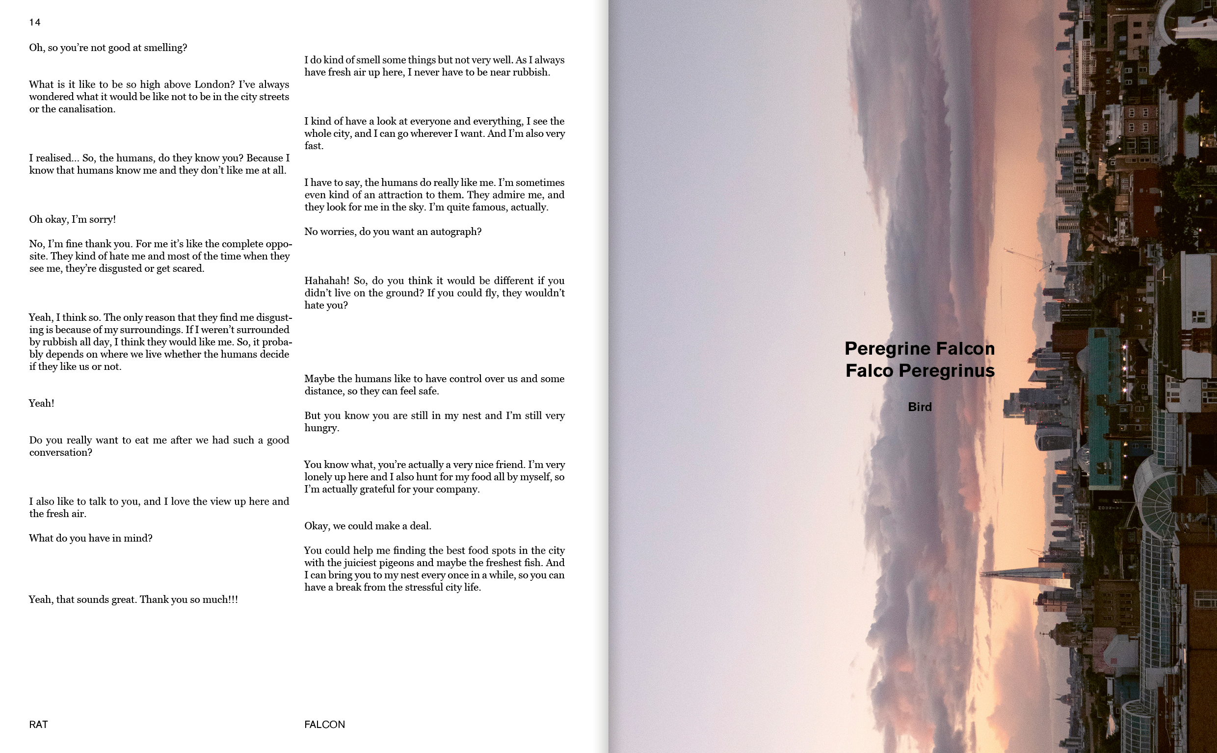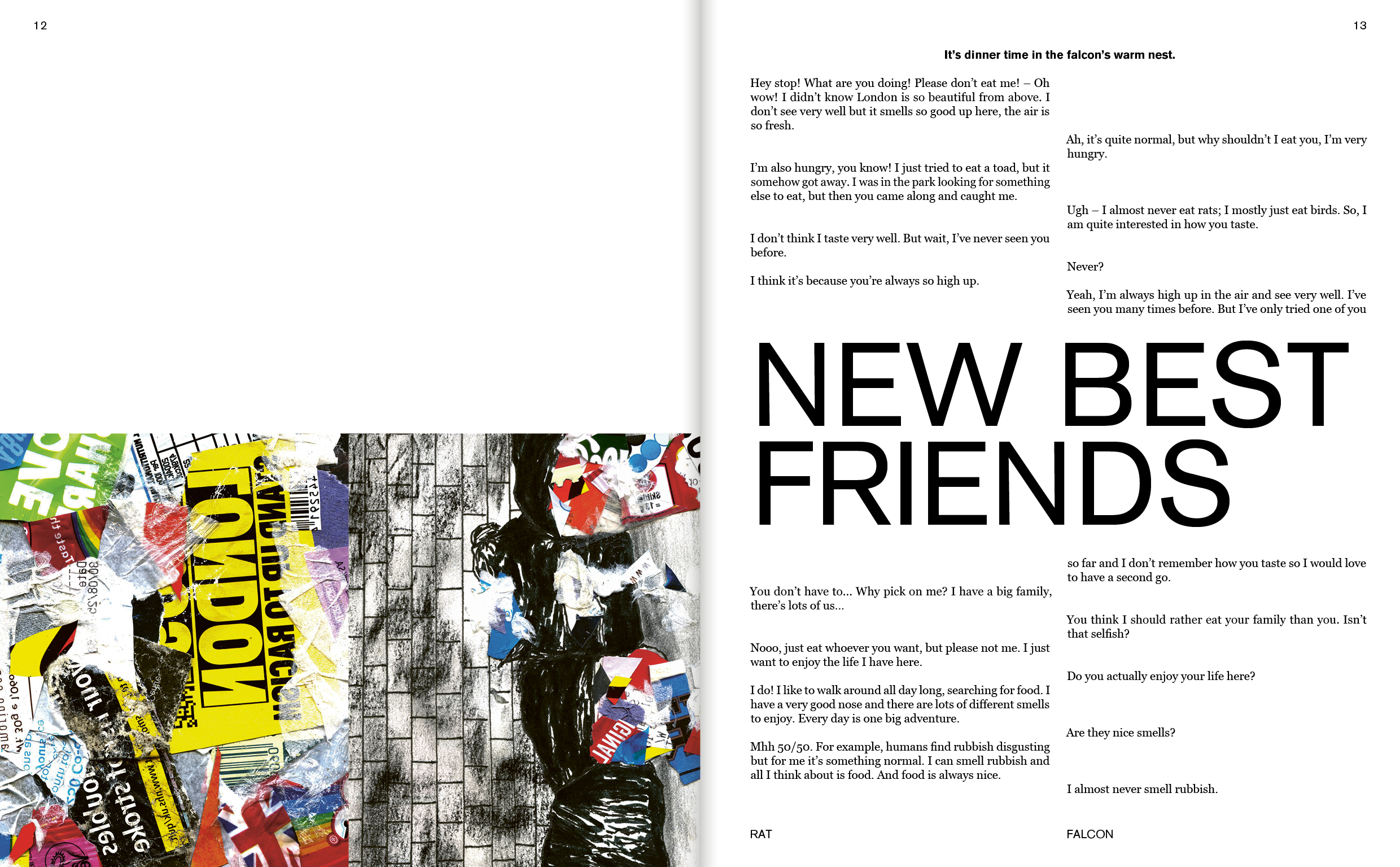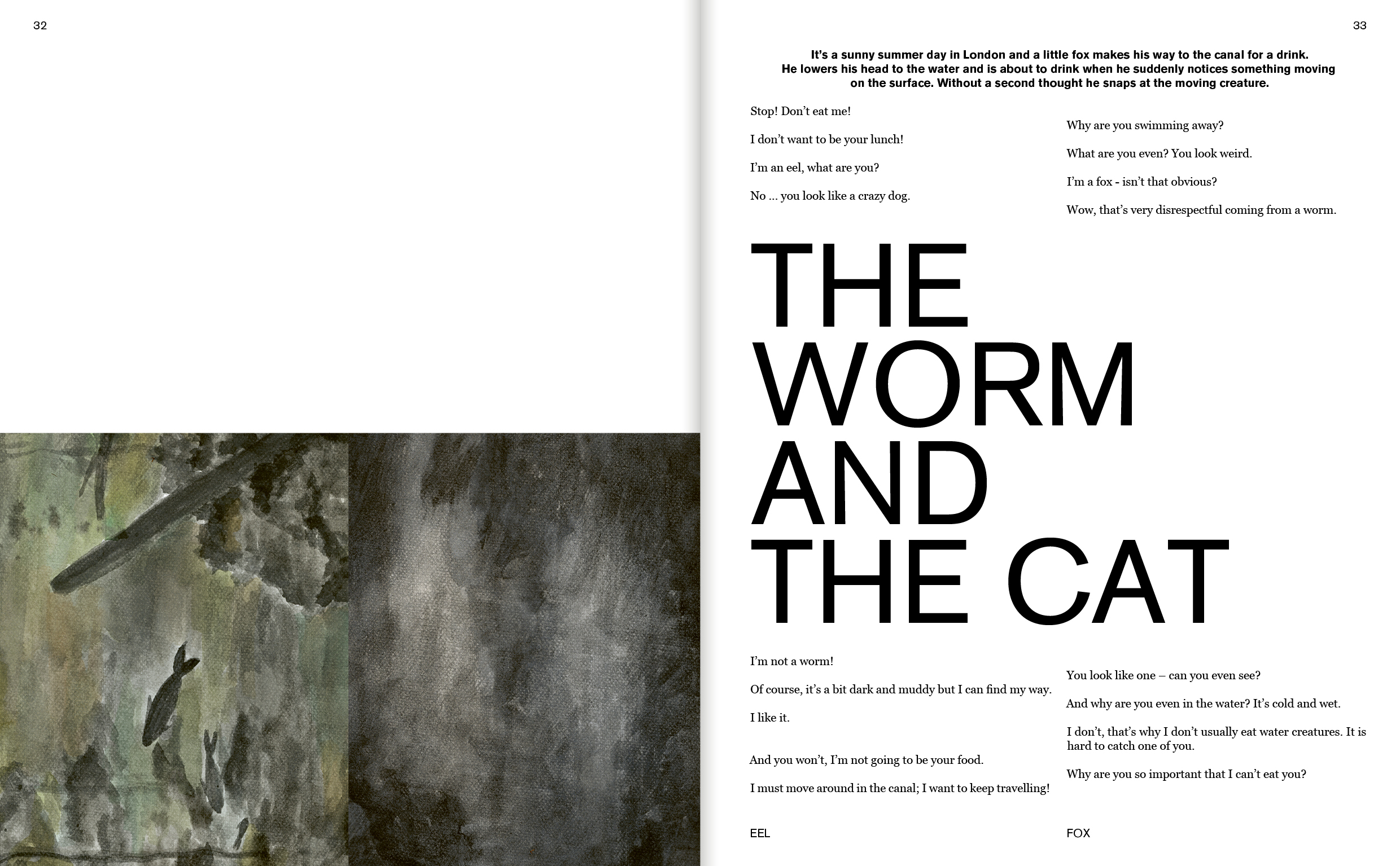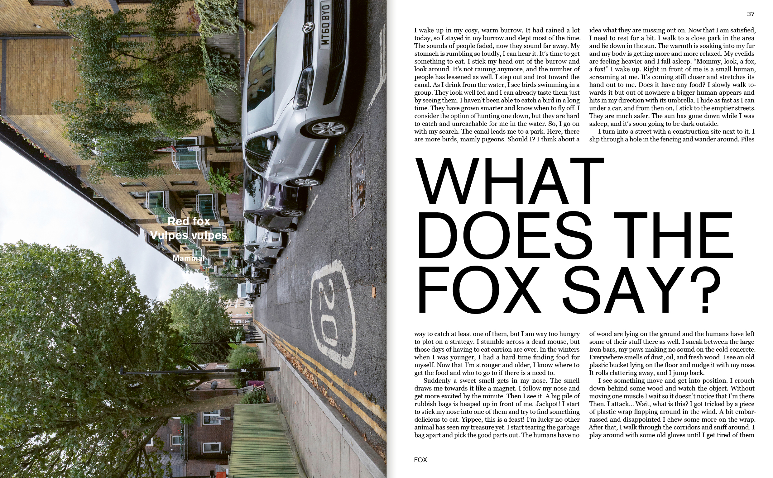 Big cities like London are full of surprises, even in places where you least expect them. This book shows that wild animals have long become part of the urban habitat. Foxes, birds, and pikes appear as silent cohabitants of the city. Short dialogues paint a picture of urban nature, while abstract image sequences create a visual pause and reveal the animals’ perspective. In this way, “When the City Roars” becomes a loud narrative about quiet life – a glimpse into the wild heart of London that continues to beat even amid the urban hustle and bustle.